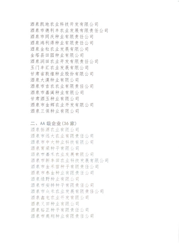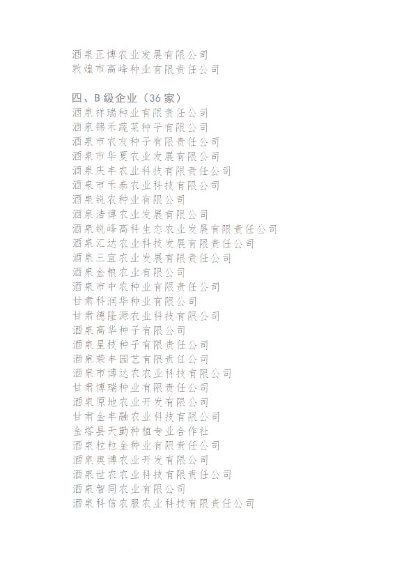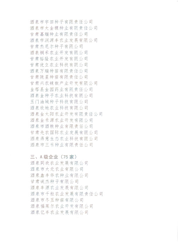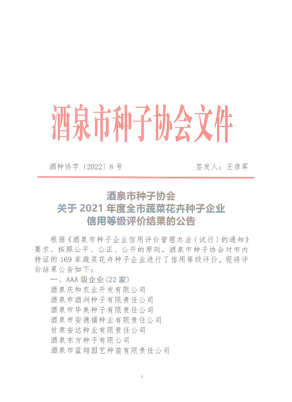 酒泉市種子協(xié)會關于2021年度全市蔬菜花卉種子企業(yè)信用等級評價結果的公告