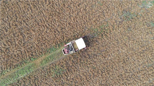 △2021年11月3日,在位于山東省東營市的黃河三角洲農(nóng)業(yè)高新技術(shù)產(chǎn)業(yè)示范區(qū),工人正操控機(jī)械開鐮收割東航D11號航天大豆。