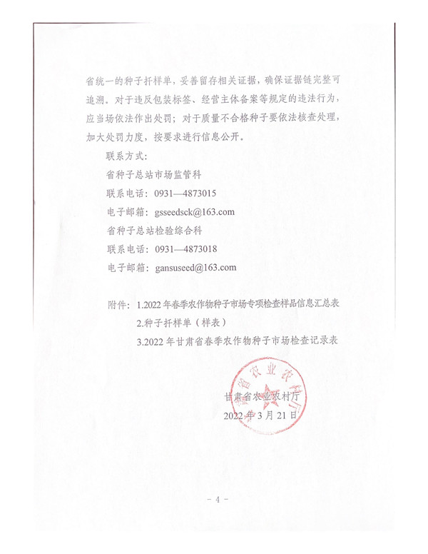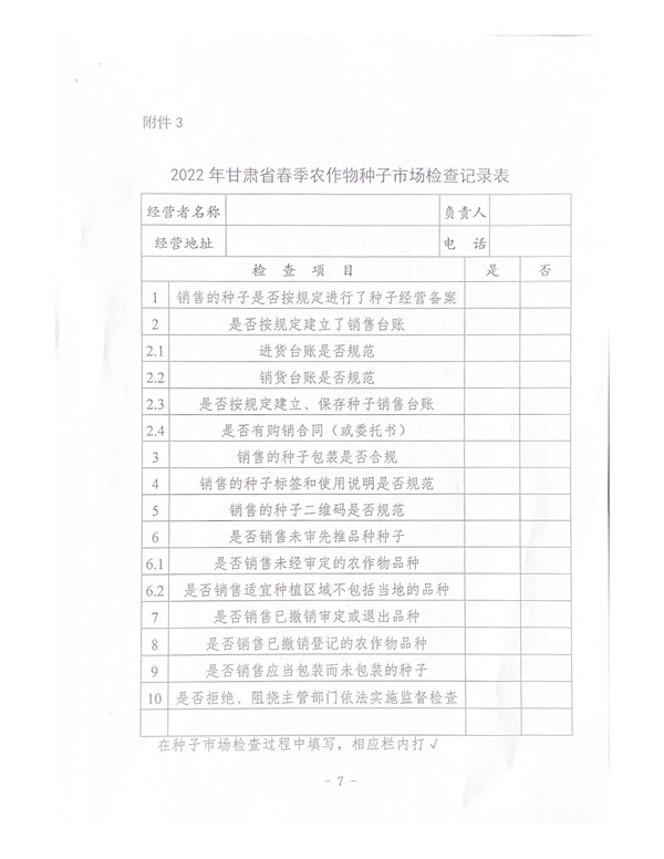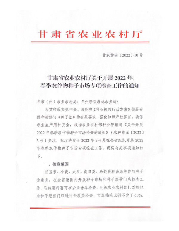 甘農(nóng)種函〔2022〕10號 甘肅省農(nóng)業(yè)農(nóng)村廳關(guān)于開展2022年春季農(nóng)作物種子市場專項檢查工..