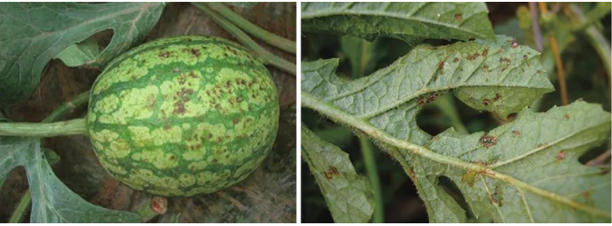 西瓜細菌性角斑病果實癥狀(左圖) ;西瓜細菌性角斑病葉部癥狀 (右圖)